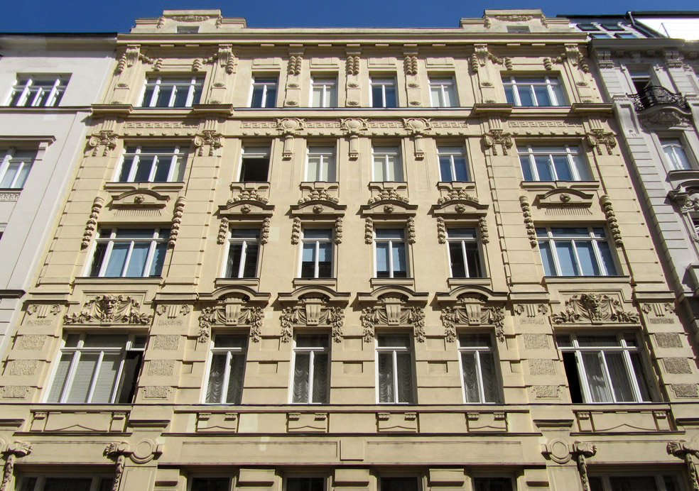 Wien 1., Biberstraße 22 Späthistorisches Wohnhaus Fassade mit secessionistischen Dekorelementen Additive Giebelfenster Seitenrisaliten mit Pilastergliederung Erbaut: 1908 Architekt: Ely Wasserstrom Home