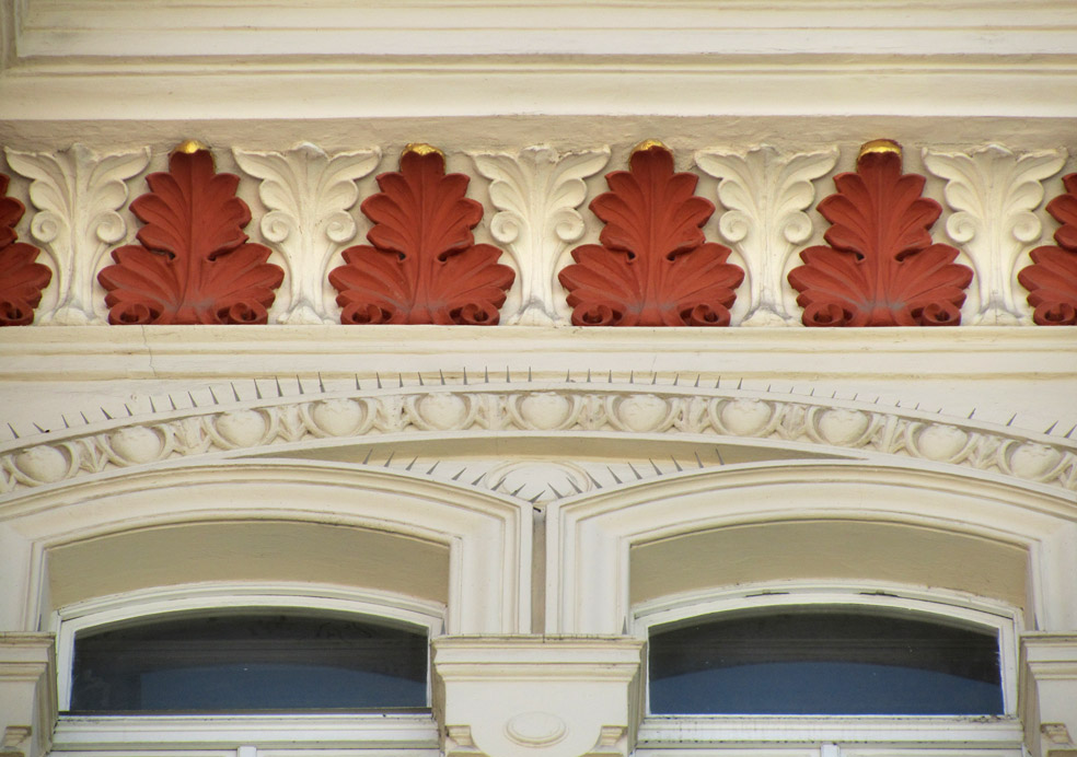 Rot und teilweise gold gefasster secessionistischer Dekor: