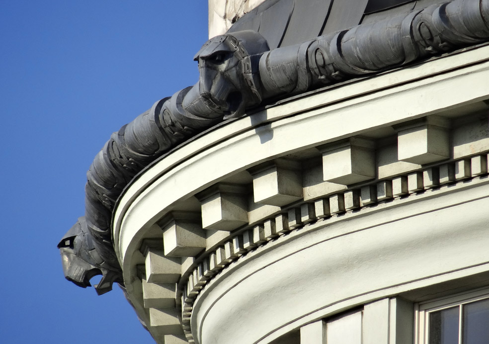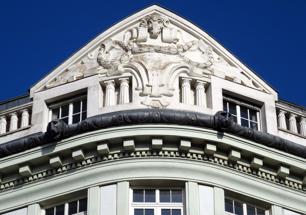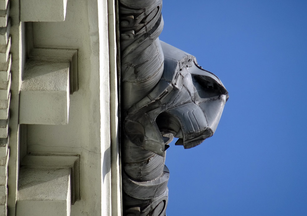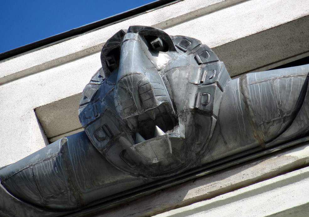Reiches Kranzgesims, darauf dekoratives Traufenblech mit Löwenköpfen