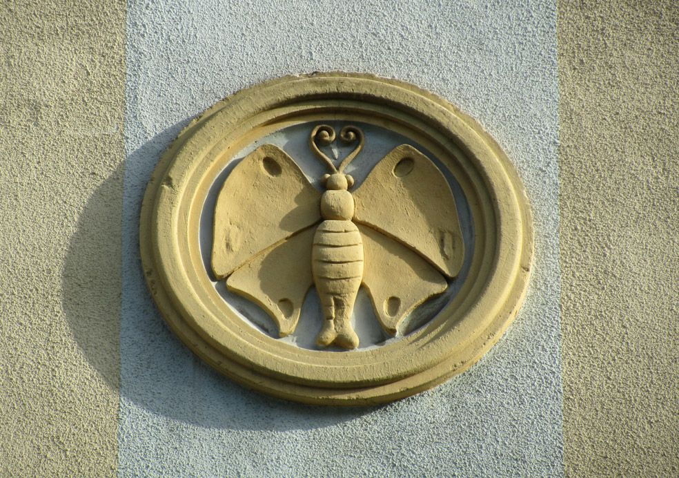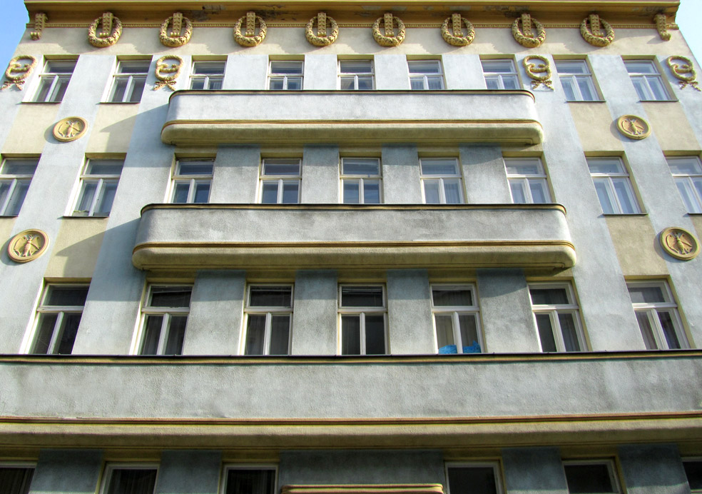Wien 15., Herklotzgasse 7 Secessionistisches Zinshaus Gestaffelte Balkonbänder Sparsame Dekoration mit Kränzen und Tondi mit Schmetterlingen Erbaut: 1912 Architekt: Albert Blanda Home